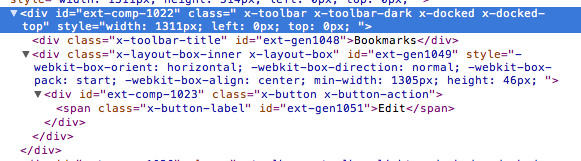 I’ve highlighted “x-toolbar-dark”, because by default, the “UI” configuration option for Ext.Toolbar is set to “dark,” which applies the “x-toolbar-dark” class to your toolbar (it will apply “x-toolbar-light” if you specify “light” for ui…more on this later).
