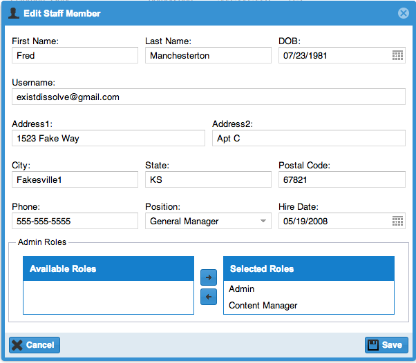 We also want to upgrade our Staff management form with these form fields, one for adding/altering the Username, and another to allow for the selection of the Staff person’s Roles (I suggest an Ext.ux.form.field.ItemSelector for this one…). In the end, we need it to look something like this: