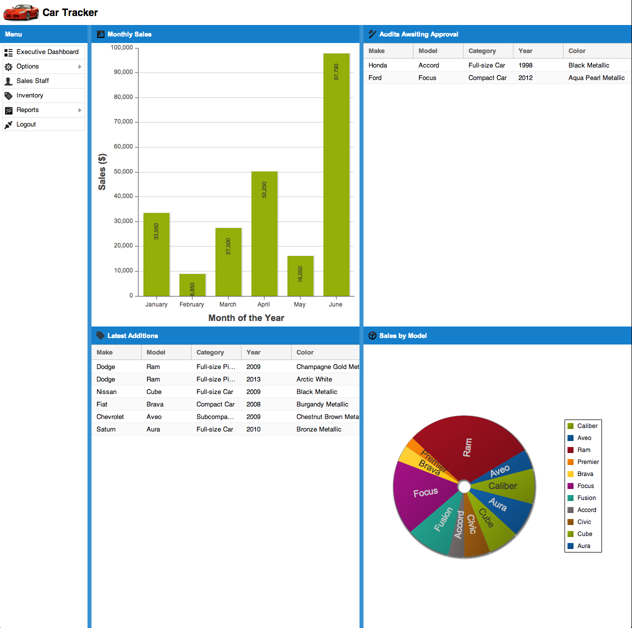 sencha-logoWith the successful roll-out of our workflow system, management has come up with another great idea: an Executive Dashboard. The main idea is that when anyone with the “Admin” role logs in, they should be greeted with a “dashboard” of sorts that will allow them to see a variety of details from across the application, such as snapshots of the charts we previously built, outstanding workflow actions, and the most recently added inventory records.
