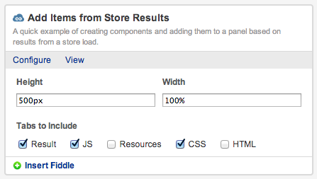 To insert a fiddle, click the “Configure” link. You’ll see a variety of options (all of which should reflect the defaults you’ve set in the module configuration). You can override any defaults you like. Once you have the fiddle configured the way you’d like it, simply click “Insert FIddle”, and your configured fiddle will be inserted into the content area.