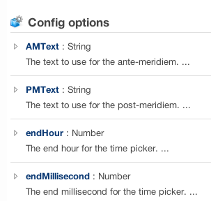 Anyway, if you’re interested, check out the documentation for JSDuck, and enjoy the screenshots of my documented component below.